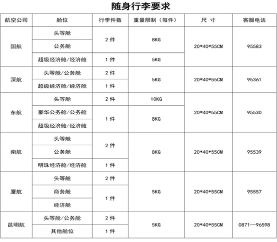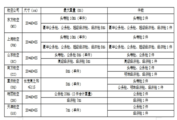 臨汾機場執飛航空公司的隨身手提行李標準