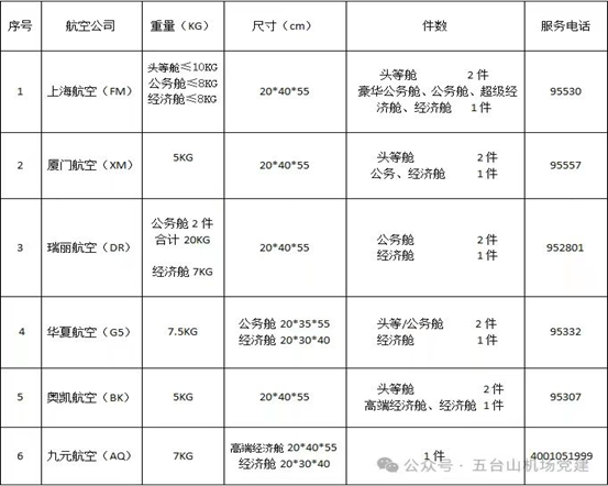 五臺山機場執飛航空公司的隨身手提行李標準