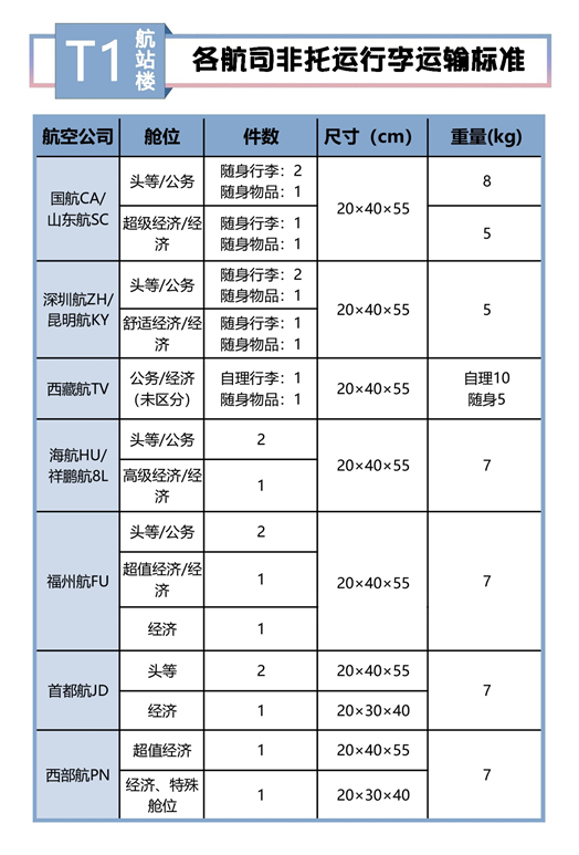 太原機場執飛航空公司的隨身手提行李標準