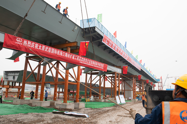 2024年9月27日,隨著太原武宿國(guó)際機(jī)場(chǎng)三期改擴(kuò)建工程高架橋項(xiàng)目首聯(lián)鋼箱梁最后一節(jié)挑臂穩(wěn)穩(wěn)地落在支架上,標(biāo)志著高架橋項(xiàng)目建設(shè)取得關(guān)鍵性進(jìn)展,進(jìn)入鋼箱梁架設(shè)新階段。